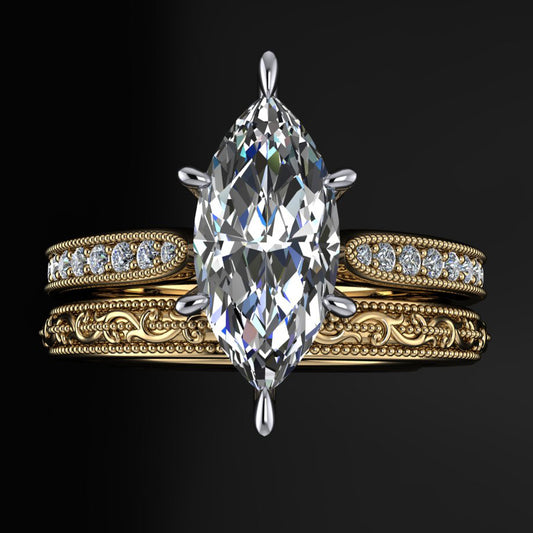 perla tatum wedding set - 1.5 carat marquise moissanite engagement ring, milgrain wedding ring, ZAYA moissanite