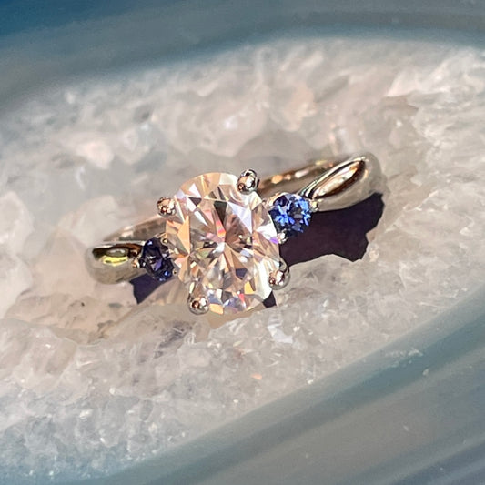 savannah ring – 1.5 carat oval moissanite engagement ring, sapphire side stones