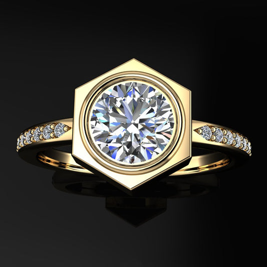 aspen ring - 1 carat round moissanite engagement ring, hexagon ring, diamond band