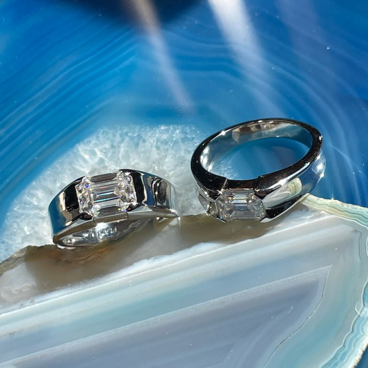 pierre ring - emerald cut moissanite mens ring, 4.35 ctw, wide platinum wedding band