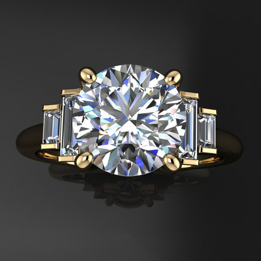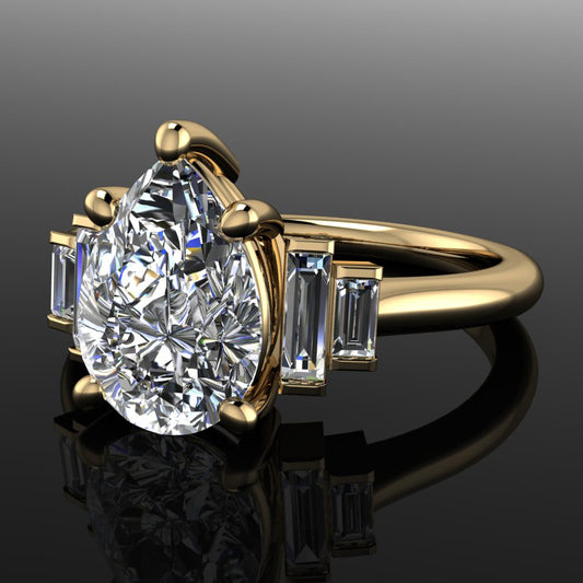 evelyn ring – 3 carat pear cut moissanite engagement ring, bezel set baguette side stones