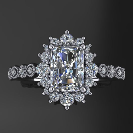 frankie ring - 2 carat elongated cushion and radiant cut combo moissanite halo engagement ring