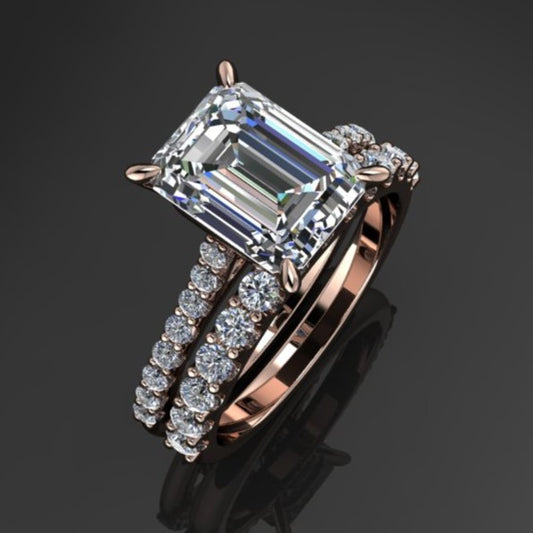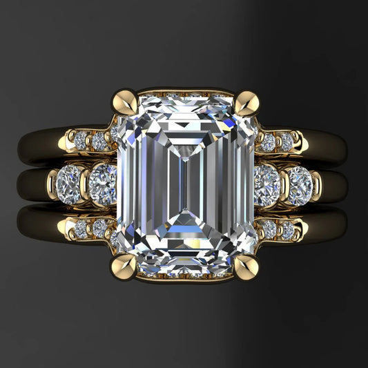 demi ring - emerald cut moissanite engagement ring, trapezoid side stones, diamond side halo