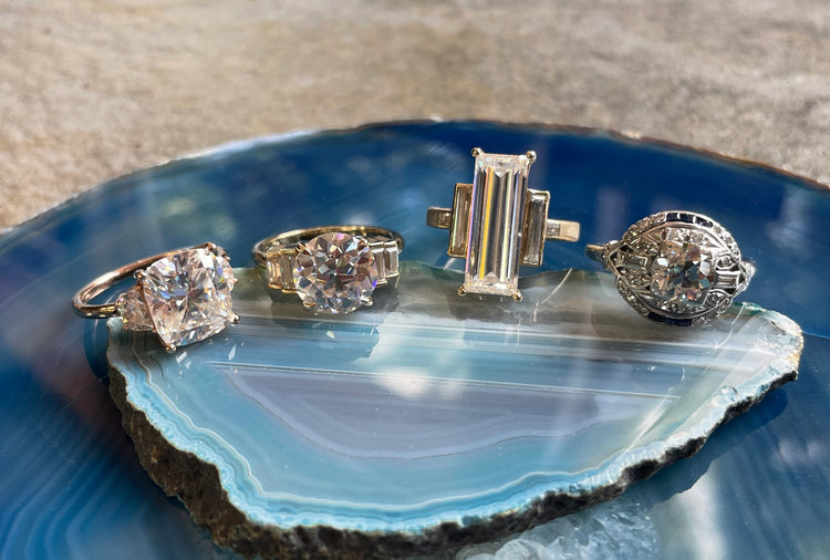 Our engagement rings are the flagship product in our store. We specialize in moissanite and lab grown diamond engagement rings, although we can make anything your 'lil heart desires, with genuine diamonds, sapphires, rubies, aquamarine, you name it.