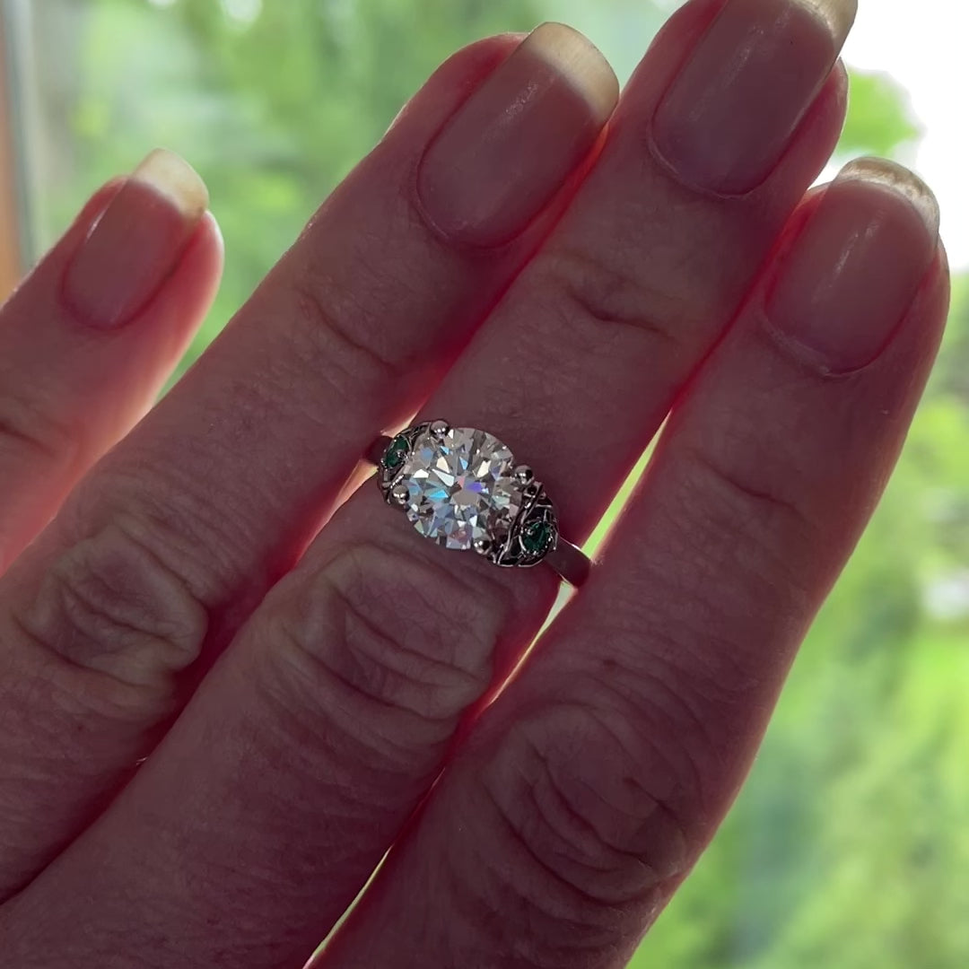 Ready to ship in a size 4.5! A gorgeous 2 carat round moissanite is hand set in our beautiful Seana setting, in 14k white gold. Seana has Celtic detailing on either side of the center stone, with a small created emerald accent in the center of each.